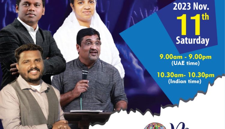 ഷാർജ : പ്രാർത്ഥനാസംഗമം ഒരുക്കുന്ന 12 മണിക്കൂർ പ്രാർത്ഥനയും ഉപവാസവും നവംബർ 11 ശനിയാഴ്ച നാളെ രാവിലെ 9 മണി മുതൽ രാത്രി 9 മണി വരെ (യു. എ. ഇ സമയം ) നടക്കും. പാസ്റ്റർ ജീവൻ രാജ് , പാസ്റ്റർ ജസ്റ്റിൻ ,പാസ്റ്റർ ബിജി കുര്യൻ ,സിസ്റ്റർ ബ്ലെസി ജോബിൻ ,