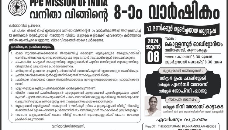 കുന്നംകുളം : പിപിസി മിഷൻ ഇന്ത്യ വനിതാ വിങ്ങിന്റെ എട്ടാമത് വാർഷികം ജൂൺ 8 ന് വലിയങ്ങാടി കൊള്ളന്നൂർ ഓഡിറ്റോറിയത്തിൽ നടക്കും.