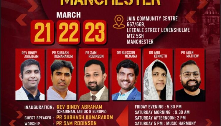 മാഞ്ചസ്റ്റർ : അസംബ്ലീസ് ഓഫ് ഗോഡ്, ഐ എ ജി യൂ കെ & യൂറോപ്പ് 18 മത് നാഷണൽ കോൺഫറൻസ് മാർച്ച് 21 വെള്ളിയാഴ്ച മുതൽ ഇംഗ്ലണ്ടിലെ മാഞ്ചസ്റ്റർ പട്ടണത്തിൽ ആരംഭിക്കും.