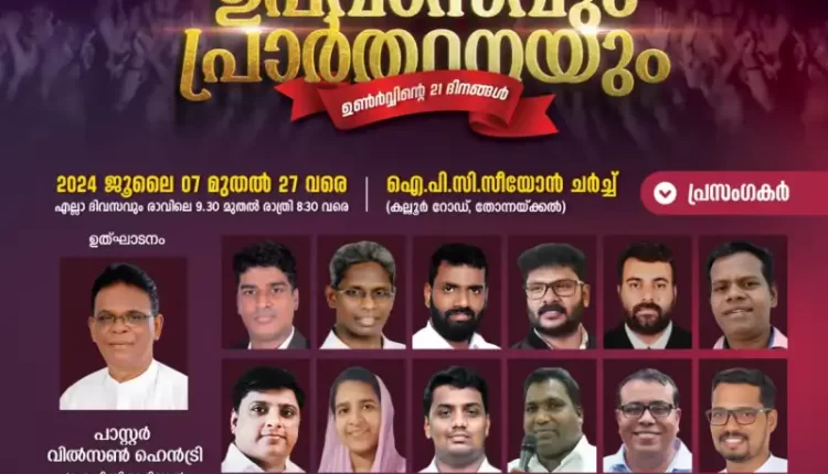 ആറ്റിങ്ങൽ : ഐ.പി.സി ആറ്റിങ്ങൽ സെൻ്റർ പ്രയർ ബോർഡിൻ്റെ ആഭിമുഖ്യത്തിൽ ജൂലൈ 7 മുതൽ 27 വരെ തോന്നയ്ക്കൽ ഐ.പി.സി സിയോൻ ചർച്ചിൽ 21 ദിവസത്തെ ഉപവാസ പ്രാർത്ഥന നടക്കും.