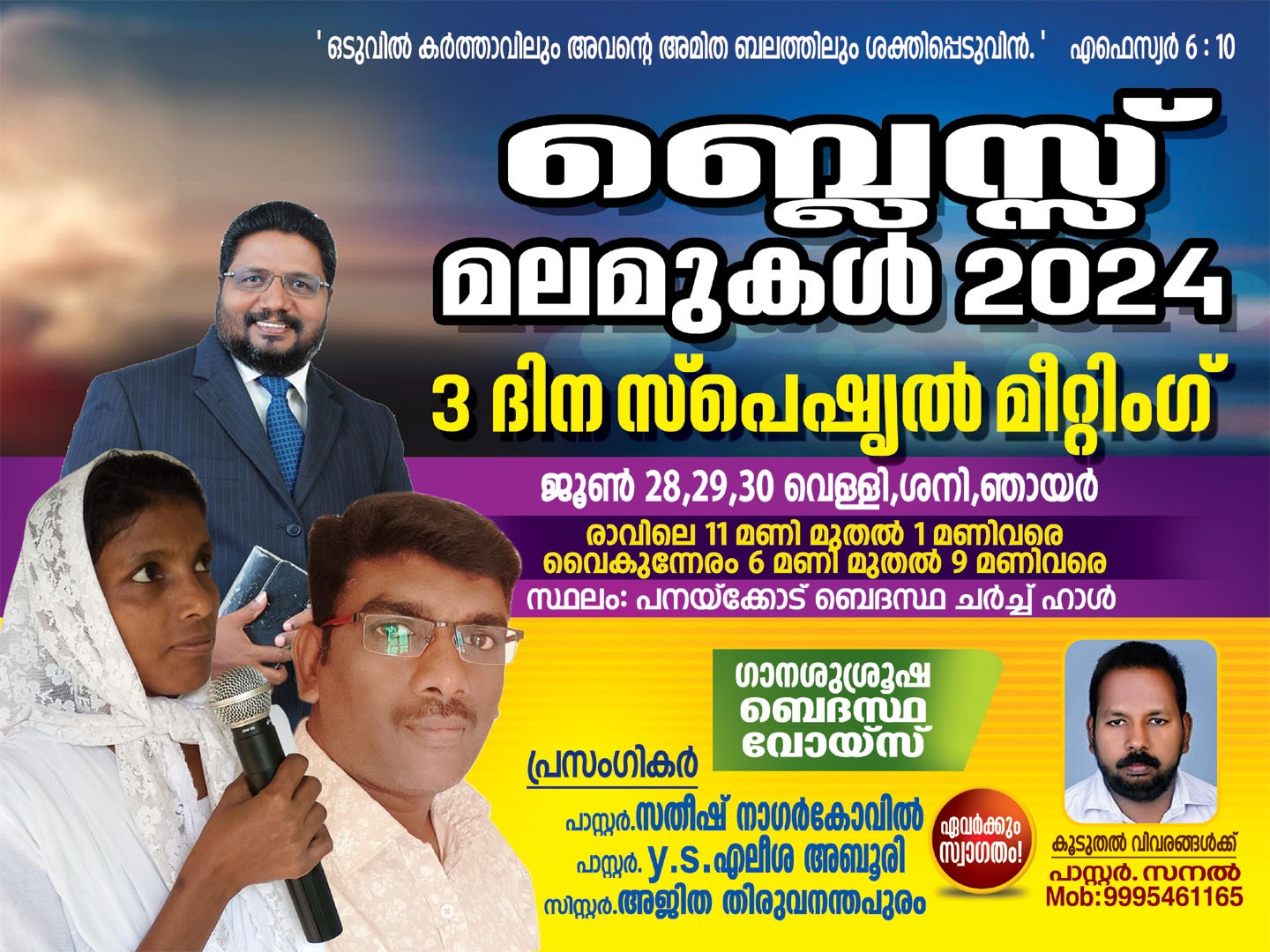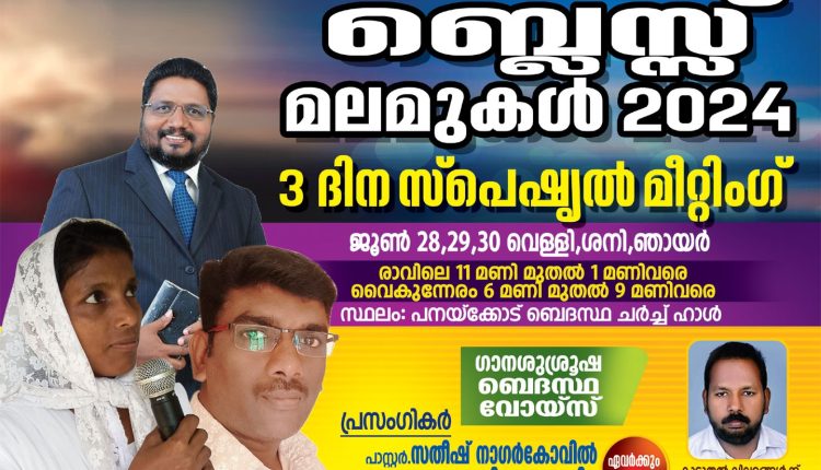 പനയ്ക്കോട് : പനയ്ക്കോട് ബെദസ്ഥ ചർച്ചിന്റെ ആഭിമുഖ്യത്തിൽ ജൂൺ 28 മുതൽ 30 വരെ പനയ്ക്കോട് ചർച്ച് ഹാളിൽ 3 ദിന സ്പെഷ്യൽ മീറ്റിംഗ് നടക്കുന്നു. പാ സതീഷ് (നാഗർകോവിൽ), പാ വൈ എസ് എലീശാ (അബൂരി), സിസ്റ്റർ അജിത (തിരുവനന്തപുരം) എന്നിവർ പ്രസംഗിക്കുന്നു. ബെദസ്ഥ വോയിസ് വർഷിപ് ചെയ്യുന്നു പാ സനൽ നേതൃത്ത്വം നൽകും.