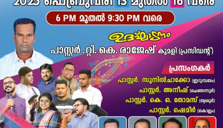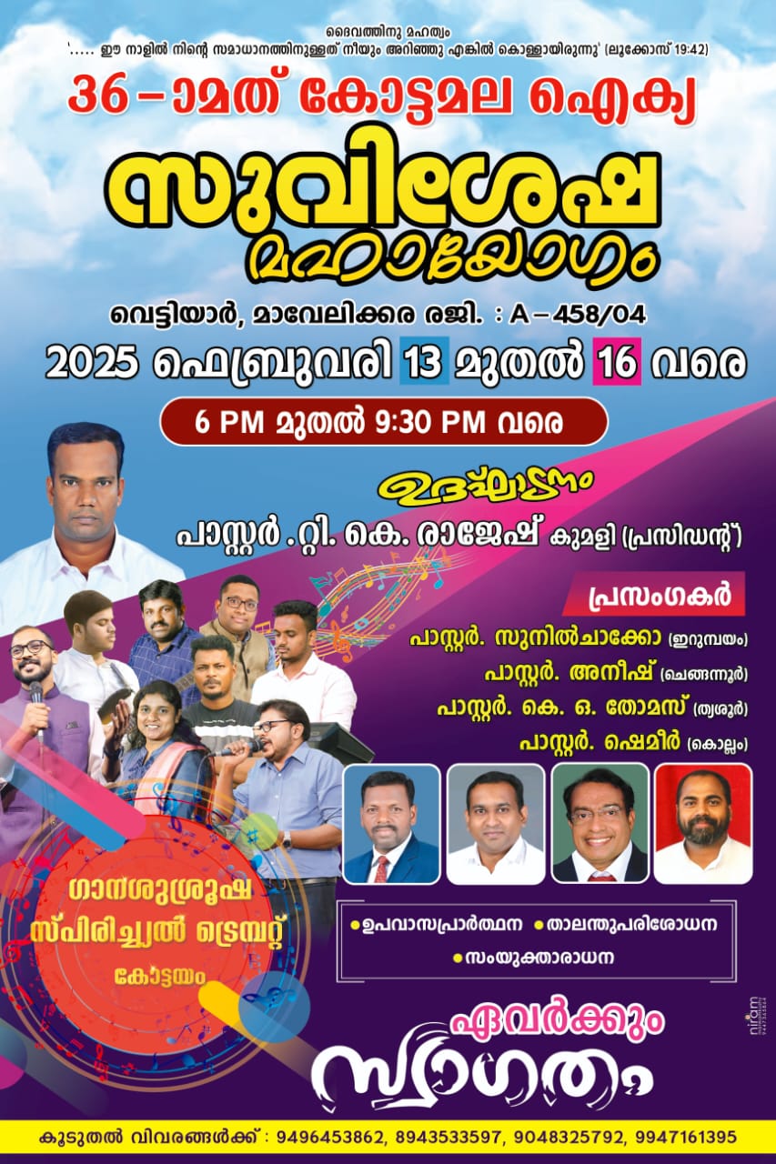 മാവേലിക്കര : 2025 ഫെബ്രുവരി 13 മുതൽ 16 വരെ വെട്ടിയാറിൽ 36-ാമത് കോട്ടമല ഐക്യ സുവിശേഷ മഹായോഗം നടക്കും. പാ.ടി കെ രാജേഷ് കുമളി ഉദ്ഘാടനം നിർവഹിക്കും.