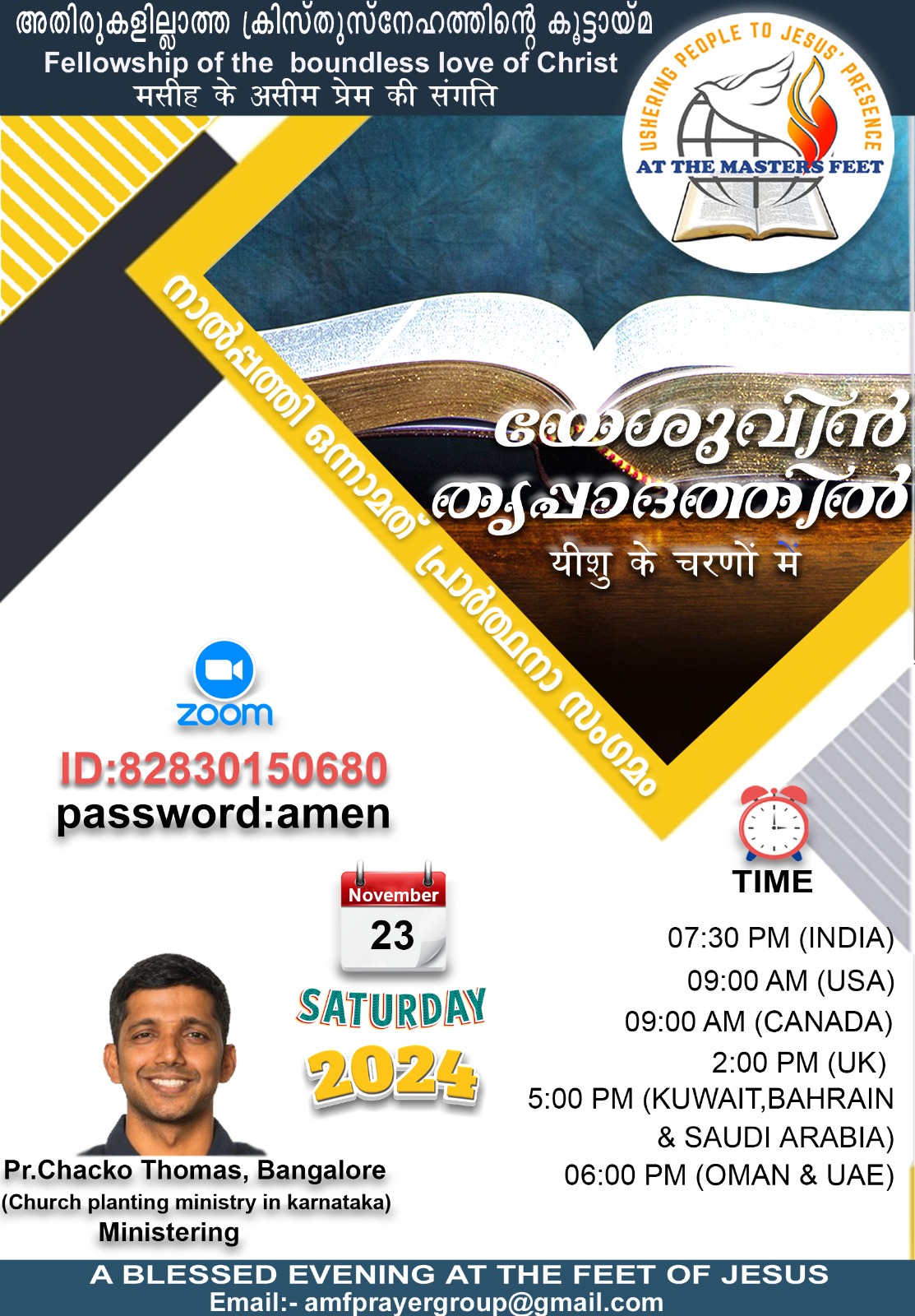 പ്രാർത്ഥനാ സംഗമം നാളെ രാത്രി 7.30ന് ഓൺലൈനിൽ നടക്കും. പാസ്റ്റർ റോജി വർഗീസ്, കാസർഗോഡ് യോഗത്തിൽ