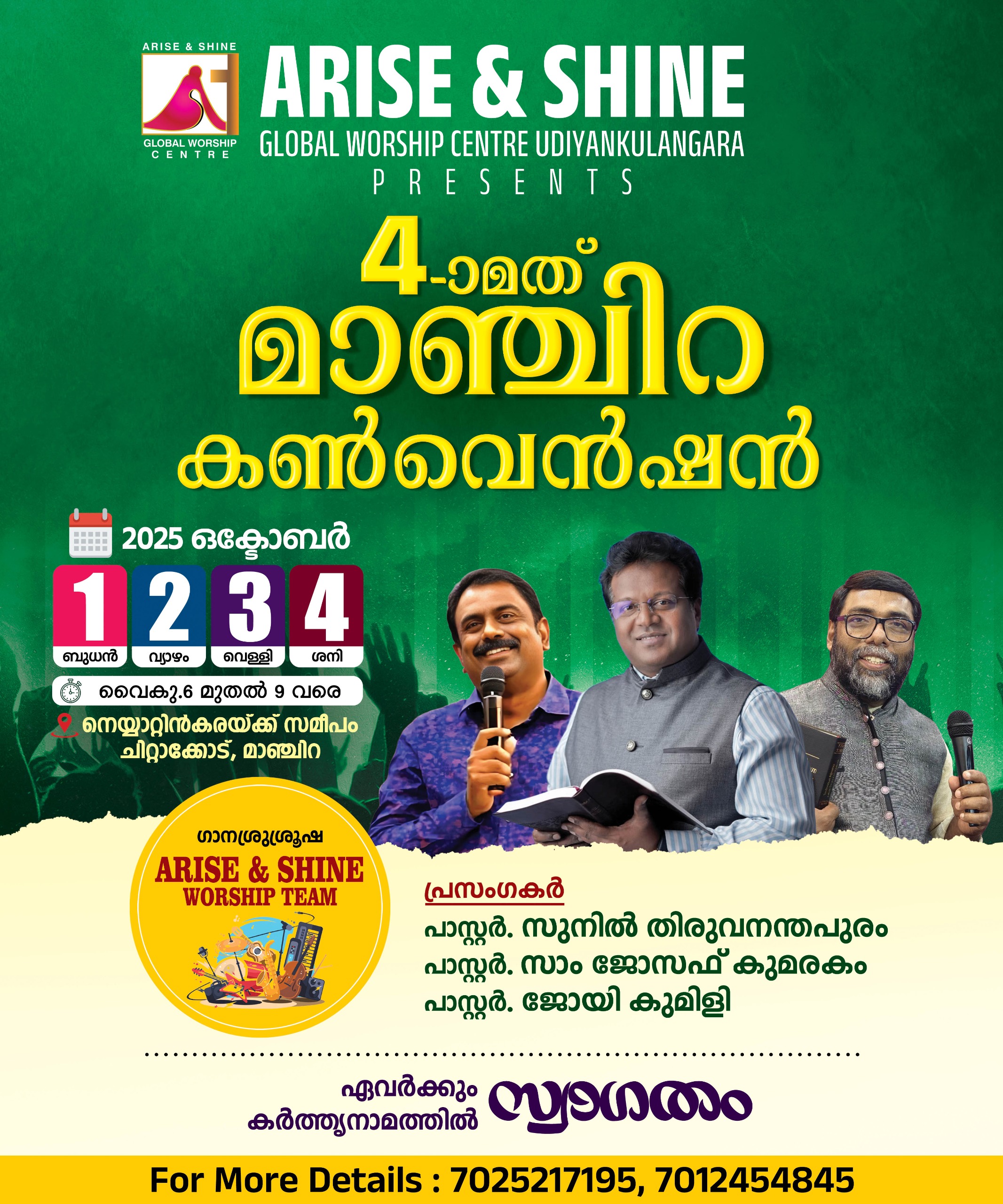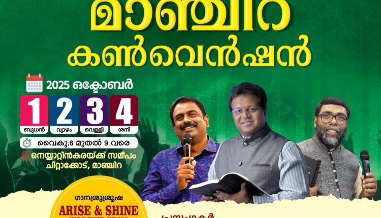 മാഞ്ചിറ : ഉദിയൻകുളങ്ങര എറൈസ് & ഷൈൻ ഗ്ലോബൽ വർഷിപ് സെന്ററിന്റെ ആഭിമുഖ്യത്തിൽ ഒക്ടോബർ 1 മുതൽ 4 വരെ മാഞ്ചിറ ചീറ്റാക്കോട് നെയ്യാറ്റിൻകരയ്ക്ക് സമീപം 4 -മത് മാഞ്ചിറ കൺവെൻഷൻ നടക്കും. പാസ്റ്റർമാരായ സുനിൽ തിരുവനന്തപുരം, സാം ജോസഫ്, ജോയ് കുമളി എന്നിവർ പ്രസംഗിക്കും. എറൈസ് & ഷൈൻ വർഷിപ് ടീം ഗാന ശുശ്രൂഷ നിർവഹിക്കും.