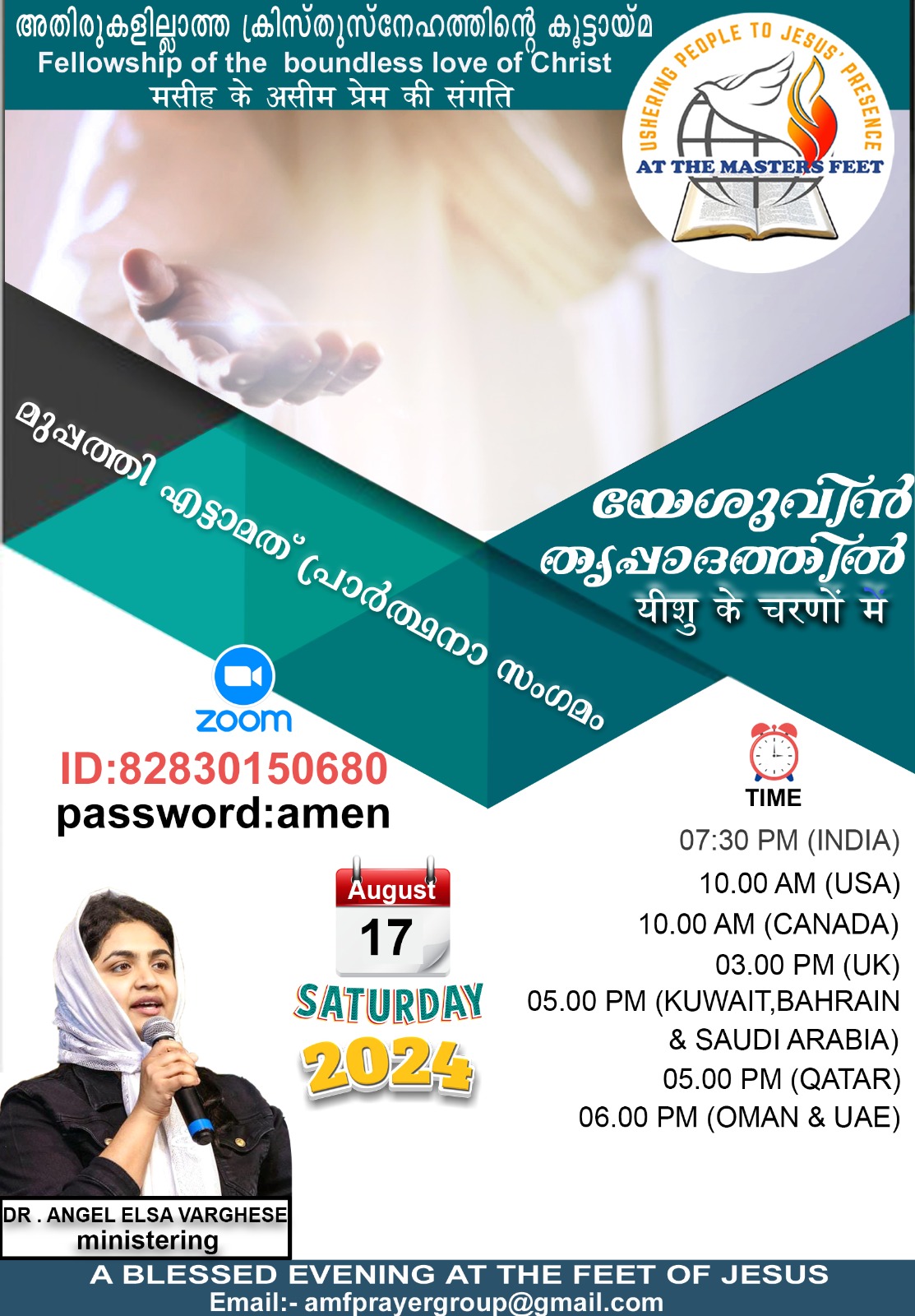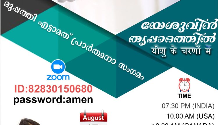 യേശുവിൻ തിരുപ്പാദത്തിൽ മിനിസ്ട്രിയുടെ ആഭിമുഖ്യത്തിൽ ആഗസ്റ്റ് 17 ശനിയാഴ്ച വൈകിട്ട് ഇന്ത്യൻ സമയം 7.30ന് സൂം പ്ലാറ്റ് ഫ്ലോമിൽ 38)-മത് പ്രാർത്ഥനാ സംഗമം നടക്കും.