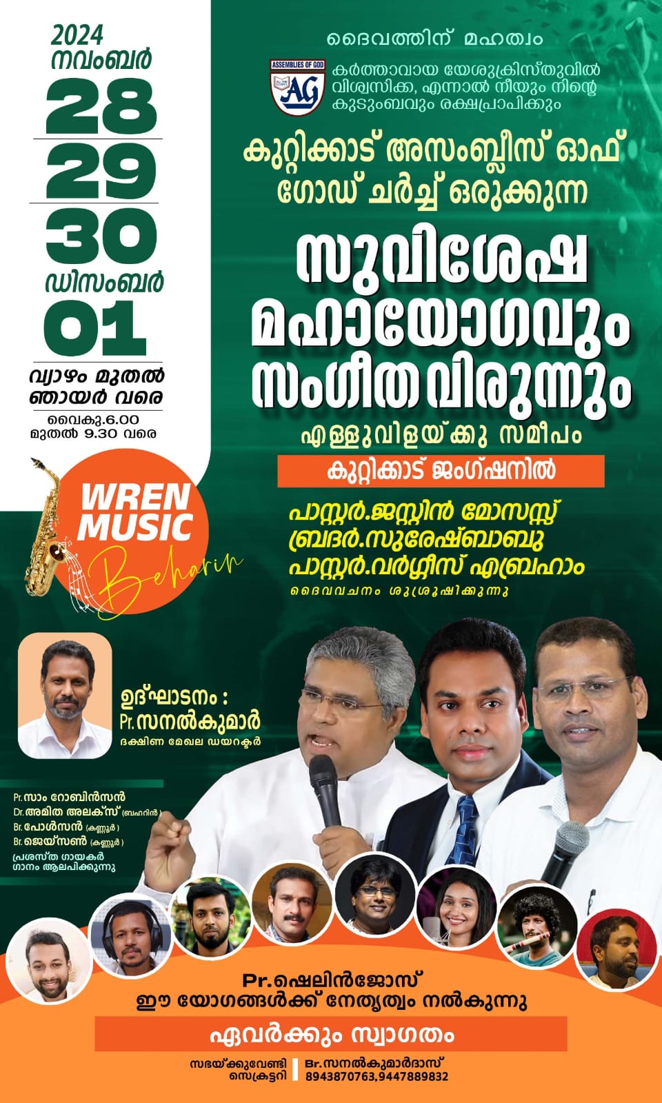പാ. സനൽകുമാർ ഉദ്ഘാടനം നിർവഹിക്കും. പാ. ജസ്റ്റിൻ മോസസ്സ്, ബ്രദർ സുരേഷ്ബാബു, പാ. വർഗ്ഗീസ് എബ്രഹാം എന്നിവർ പ്രസംഗിക്കും. ഡബ്ലിയുആർഇഎൻ മ്യൂസിക് ബഹ്റൈനിനോടൊപ്പം പാ. സാം റോബിൻസൻ, അമിത അലക്സ് സെഹറിൽ, ബ്രദർ പോൾസൻ, ബ്രദർ ജെയ്സൺ എന്നിവർ ഗാന ശുശ്രൂഷ നയിക്കും. പാ. ഷെലിൻജോസ് യോഗങ്ങൾക്ക് നേതൃത്വം നൽകും.