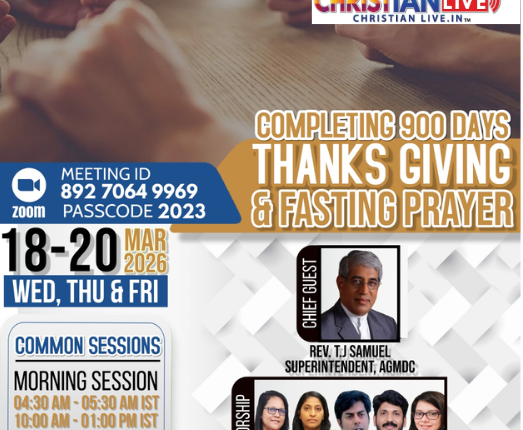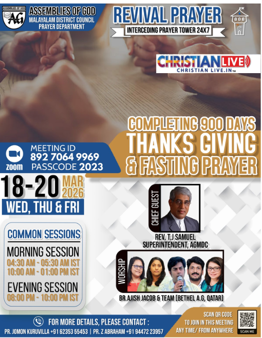 എ.ജി. മലയാളം ഡിസ്ട്രിക്ട് പ്രയർ ഡിപ്പാർട്ട്മെൻ്റ് നേതൃത്വം നല്കുന്ന തുടർമാന ഓൺലൈൻ പ്രാർത്ഥനയായ റിവൈവൽ പ്രയർ മാർച്ച് 18 ന് തുടർച്ചയായ തൊള്ളായിരം ദിവസം പിന്നിടുന്നു. അതിൻ്റെ ഭാഗമായി മാർച്ച് 18 മുതൽ 20 വരെ ദിവസവും രാവിലെ 4.30 മുതൽ 5.30 വരെയും 10 മുതൽ 1 വരെയും വൈകിട്ട് 8 മുതൽ 10 വരെയും പ്രത്യേക യോഗങ്ങൾ നടക്കും. മാർച്ച് 18 ബുധൻ ഇന്ത്യൻ സമയം രാത്രി 8 മുതൽ 10 വരെ നടക്കുന്ന സ്തോത്ര പ്രാർത്ഥനയിൽ അസംബ്ലീസ് ഓഫ് ഗോഡ് മലയാളം ഡിസ്ട്രിക്ട് കൗൺസിൽ സൂപ്രണ്ട് പാസ്റ്റർ ടി.ജെ. സാമുവേൽ മുഖ്യസന്ദേശം നല്കും. ബ്രദർ അജീഷ് ജേക്കബ് നേതൃത്വം നല്കുന്ന ദോഹ ബഥേൽ എ ജി ഗായക സംഘം ഗാനശുശ്രൂഷ നയിക്കും. പാസ്റ്റർ ജോമോൻ കുരുവിള അദ്ധ്യക്ഷത വഹിക്കും. അനുഭവസാക്ഷ്യങ്ങളും പ്രത്യേക പ്രാർത്ഥനയും ഉണ്ടായിരിക്കും.സിസ്റ്റർ സാൻ്റി കെ.കോശി, പാസ്റ്റർ റെജി ശൂരനാട്, പാസ്റ്റർ ഷാജൻ ജോൺ ഇടയ്ക്കാട്, പാസ്റ്റർ ഇസഡ്. ഏബ്രഹാം എന്നിവർ വിവിധ യോഗങ്ങൾക്ക് നേതൃത്വം നല്കും.