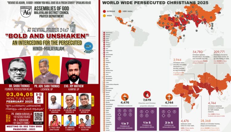 കോട്ടയം : എ.ജി. മലയാളം ഡിസ്ട്രിക്ട് പ്രയർ ഡിപ്പാർട്ട്മെൻ്റ് നേതൃത്വം നൽകുന്ന തുടർമാന ഓൺലൈൻ പ്രാർത്ഥനയായ റിവൈവൽ പ്രയറിൽ മാസാരംഭ പ്രത്യേക പ്രോഗ്രാമായി ‘Bold & Unshaken’ എന്ന പേരിൽ പ്രത്യേക പ്രാർത്ഥന ഫെബ്രുവരി 3 മുതൽ 5 വരെ നടക്കും.