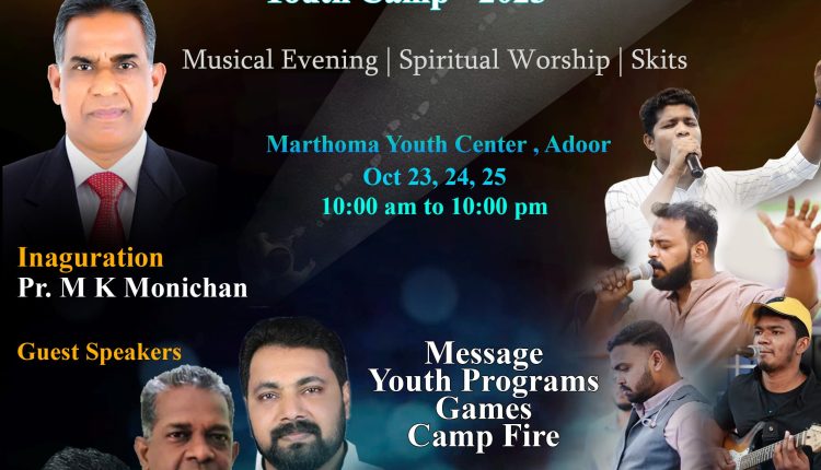 അടൂർ : International Apostolic Ministries- ന്റെ നേതൃത്വത്തിൽ ത്രിദിന യുവജന ക്യാമ്പ് അടൂർ മാർത്തോമ യൂത്ത് സെന്ററിൽ ഒക്ടോബർ23,24,25 തീയതി കളിൽ നടക്കും. 23 രാവിലെ 9 മണിക്ക് ക്യാമ്പ് ആരംഭിക്കുകയും വൈകുന്നേരം നടക്കുന്ന പൊതു യോഗത്തിൽ Pr. MK Monichan ഈ ക്യാമ്പ് ഔദ്യോഗികമായി ഉത്ഘാടനം ചെയ്യുന്നതുമാണ്. തുടർന്നുള്ള ദിവസങ്ങളിൽ ക്രിസ്തുവിൽ പ്രസിദ്ധരായ Pr. Jacob John, Pr. Aji Antony, Pr. Jomon Vazhappara തുടങ്ങിയവർ ദൈവവചനം സംസാരിക്കുന്നു