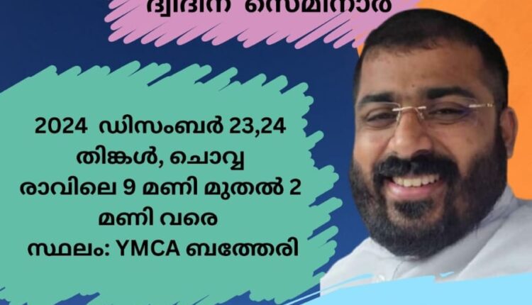 ബത്തേരി : വയനാട് സുവാർത്ത സെന്റർ ഒരുക്കുന്ന കുട്ടികൾക്കായുള്ള ദ്വിദിന സെമിനാർ ഡിസംബർ 23, 24 ( തിങ്കൾ, ചൊവ്വ ) തീയതികളിൽ സുൽത്താൻബത്തേരി വൈ എം സി എ ഹാളിൽ നടക്കും. ദിവസവും രാവിലെ 9 മണി മുതൽ 2 വരെ നടക്കുന്ന സെമിനാറിൽ റവ ഡോ