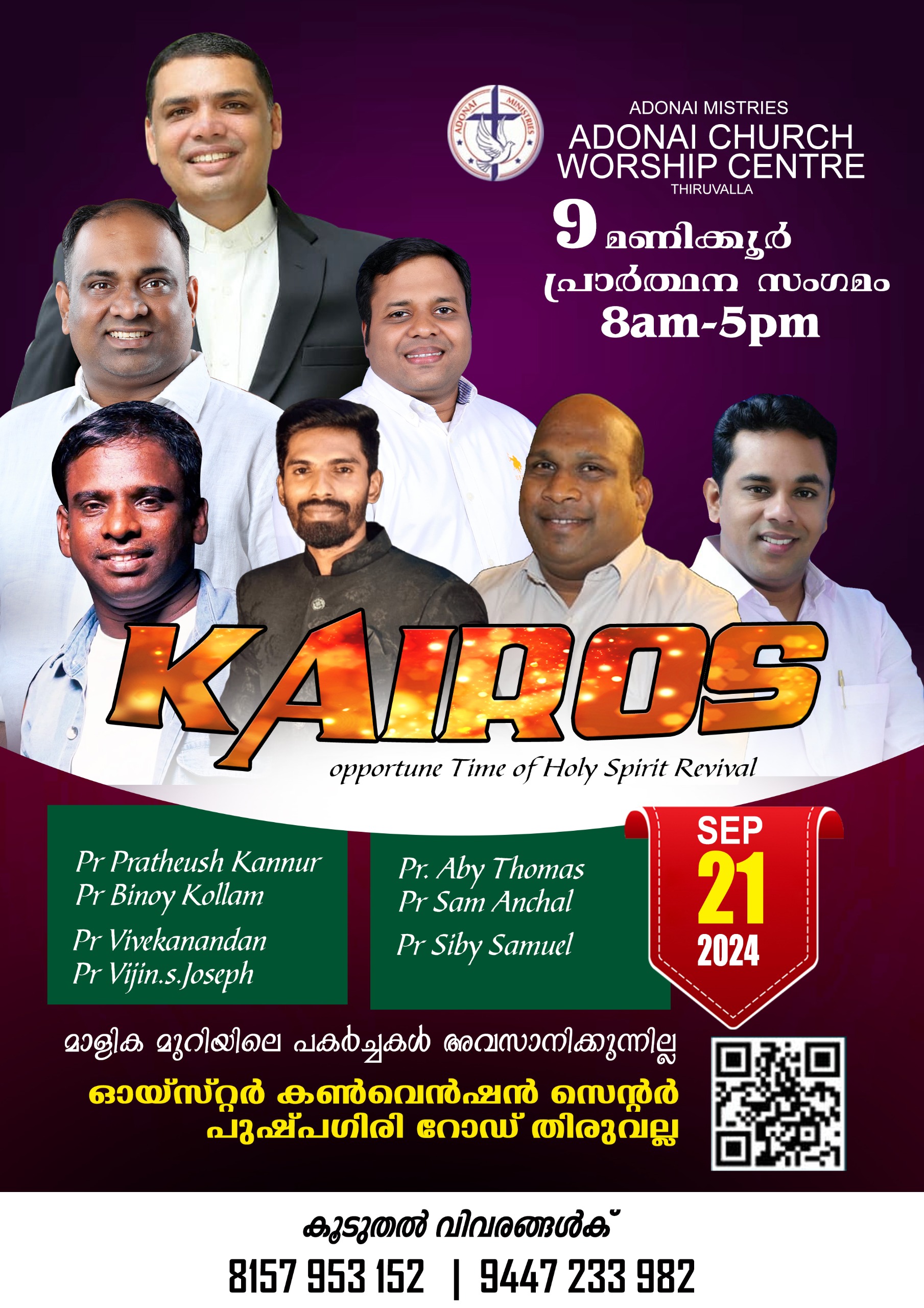 തിരുവല്ല : അഡോണായി മിനിസ്ട്രീസിന്റെ ആഭിമുഖ്യത്തിൽ സെപ്റ്റംബർ 21 ന് തിരുവല്ല പുഷ്പഗിരി റോഡ് ഓയ്സ്റ്റർ കൺവെൻഷൻ സെന്ററിൽ 9 മണിക്കൂർ പ്രാർത്ഥനാ സംഗമം നടക്കും.