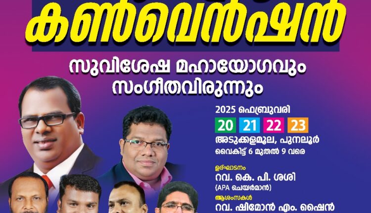 പുനലൂർ : ഗിൽഗാൽ വേൾഡ് മിനിസ്ട്രിയുടെയും അഖിലേന്ത്യാ പെന്തകോസ്ത് ഐക്യവേദിയുടെയും ആഭിമുഖ്യത്തിൽ ഫെബ്രുവരി 20 മുതൽ 23 വരെ പുനലൂർ അടുക്കളമൂലയിൽ സുവിശേഷ മഹായോഗവും സംഗീതവിരുന്നും നടക്കും.