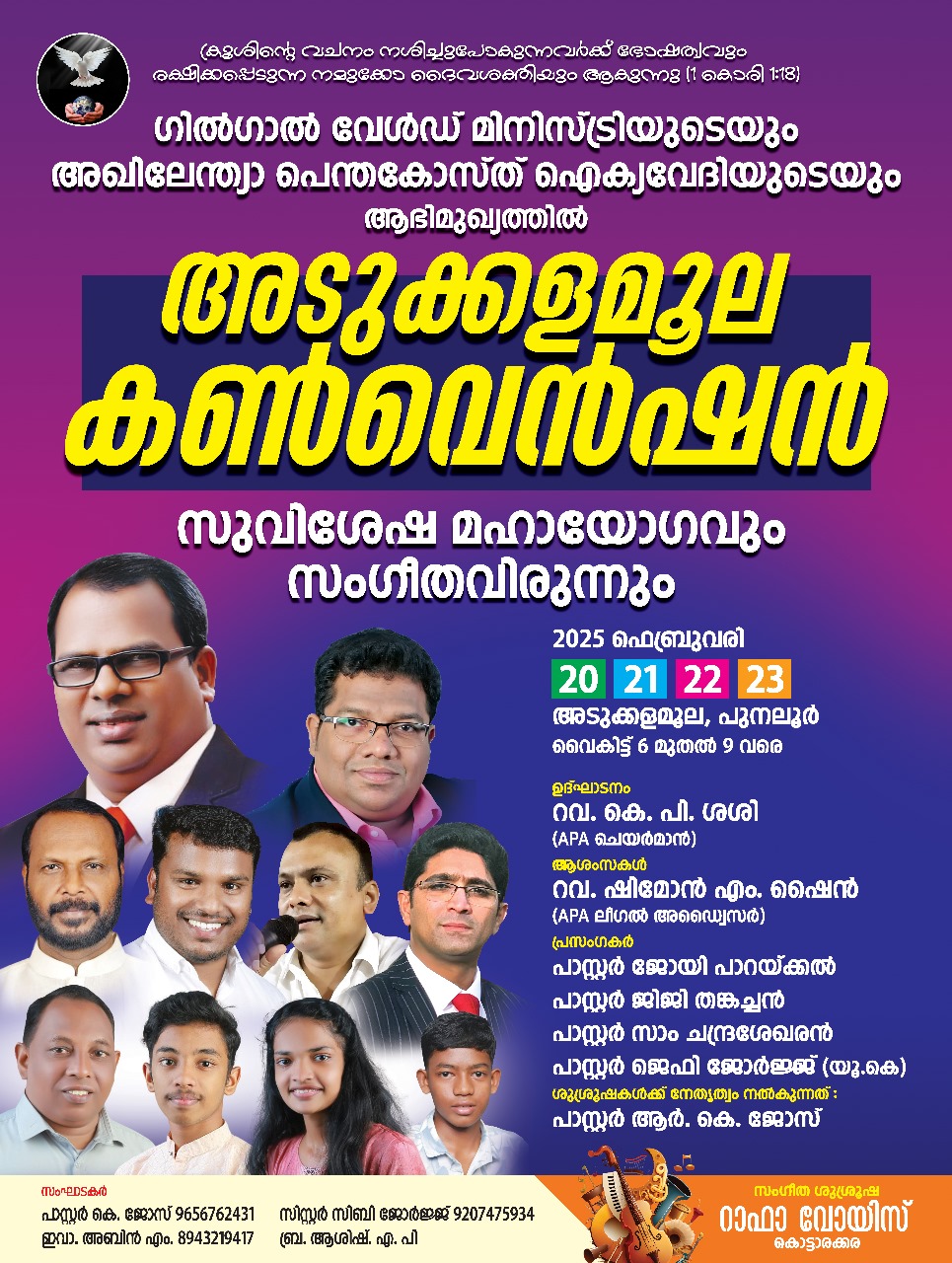 റവ. കെ പി ശശി ഉദ്ഘാടനം നിർവഹിക്കും. റവ. ഷിമോൻ എം ഷൈൻ അധ്യക്ഷത വഹിക്കും. പാ. ജോയി പാറയ്ക്കൽ, പാ. ജിജി തങ്കച്ചൻ, പാ. സാം ചന്ദ്രശേഖരൻ, പാ. ജെഫി ജോർജ് എന്നിവർ പ്രസംഗിക്കും. പാ. ആർ കെ ജോസ് ഗാന ശുശ്രൂഷയ്ക്ക് നേതൃത്വം നൽകും. റാഫാ വോയിസ്