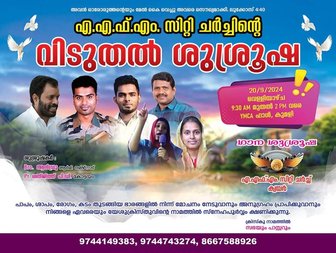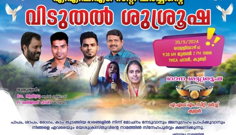 കുമളിയിൽ എ.എഫ്.എം. സിറ്റി ചർച്ച് വിടുതൽ ശുശ്രുഷ ChristianNews On Sep 11, 2024 109 കുമളി : എ.എഫ്.എം. സിറ്റി ചർച്ചിന്റെ ആഭിമുഖ്യത്തിൽ സെപ്റ്റംബർ 20 ന് കുമളി വൈ.എം.സി.എ ഹാളിൽ വിടുതൽ ശുശ്രുഷ നടക്കും. ബ്രദർ ആൻഡ്രൂ, പാ. രഞ്ജിത്ത് പി.ഡി എന്നിവർ പ്രസംഗിക്കും. എ.എഫ്.എം. സിറ്റി ചർച്ച് ക്വയർ ഗാന ശുശ്രുഷ നയിക്കും. 109 Share