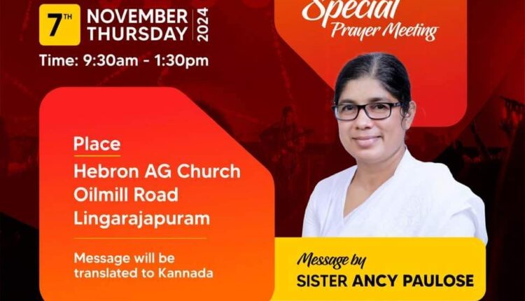 എജി ബാംഗ്ലൂർ നോർത്ത് ടു സെക്ഷൻ ഡബ്ലിയു.എം.സി. സ്പെഷ്യൽ പ്രയർ മീറ്റിംഗ് ChristianNews On Oct 30, 2024 66 ലിംഗരാജപുരം : എജി ബാംഗ്ലൂർ നോർത്ത് ടു സെക്ഷന്റെ ആഭിമുഖ്യത്തിൽ നവംബർ 7 ന് ലിംഗരാജപുരം ഹെബ്രോൺ എജി ചർച്ചിൽ ഡബ്ലിയുഎംസി സ്പെഷ്യൽ പ്രയർ മീറ്റിംഗ് നടക്കും. സിസ്റ്റർ ആൻസി പൗലോസ് പ്രസംഗിക്കും. 66 Share