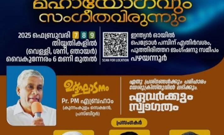 പഴയന്നൂർ : പഴയന്നൂർ എ.ജി ചർച്ചിന്റെ ആഭിമുഖ്യത്തിൽ ഫെബ്രുവരി 7 മുതൽ 9 വരെ പഴയന്നൂർ പുത്തിരിത്തറ ജംഗ്ഷനു സമീപം സുവിശേഷ മഹായോഗവും സംഗീതവിരുന്നും നടക്കും. പാ. പി എം എബ്രഹാം ഉദ്ഘാടനം നിർവഹിക്കും.