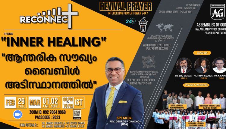 എ.ജി.റിവൈവൽ പ്രയറിൽ ഇന്നു രാത്രി 8 മണി മുതൽ ഇന്നർ ഹീലിംഗ് ക്ലാസുകൾ പാസ്റ്റർ ജോർജ് പി ചാക്കോ നയിക്കും