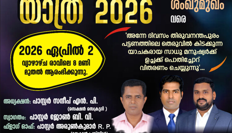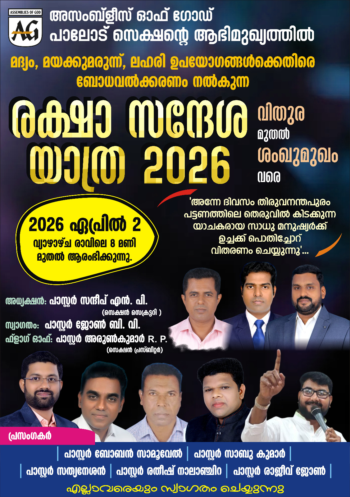 അസംബ്ലിസ് ഓഫ് ഗോഡ് പാലോട് സെക്ഷന്റെ ആഭിമുഖ്യത്തിൽ ഏപ്രിൽ 2 വ്യാഴാഴ്ച രാവിലെ 8 മണി മുതൽ വൈകുന്നേരം 7 മണി വരെ വിതുര മുതൽ ശംഖുമുഖം വരെ മദ്യം,മയക്കുമരുന്ന്,ലഹരി ഉപയോഗങ്ങൾക്കെതിരെ ബോധവൽക്കരണം നൽകുന്ന രക്ഷാ സന്ദേശ യാത്ര 2026 എന്ന പേരിൽ സുവിശേഷ യാത്ര നടത്തുന്നു