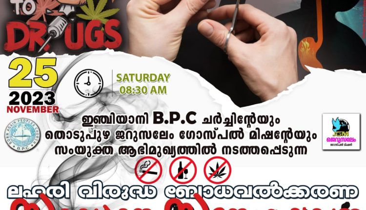 തൊടുപുഴ ജെറുസലേം ഗോസ്‌പൽ മിഷന്റെയും ഇഞ്ചിയാനി ബി പി സി ചർച്ചിന്റെയും നേതൃത്വത്തിൽ ​ഇന്ന് ഇഞ്ചിയാനി ചെരുവ് സിറ്റിയിൽ പകൽ ലഹരി വിരുദ്ധ സമാധാന റാലിയും വൈകിട്ട് മ്യൂസിക് നൈറ്റ്‌ എന്ന ആത്മീയ ശുശ്രുഷയും നടക്കുന്നു. പാസ്റ്റർ കിരൺ രാജ് നെടുംങ്കണ്ടം ദൈവവചനം ശുശ്രുഷിക്കും. ജെറുസലേം വോയിസ്‌, തൊടുപുഴ സംഗീത ശുശ്രുഷ നിർവഹിക്കും.