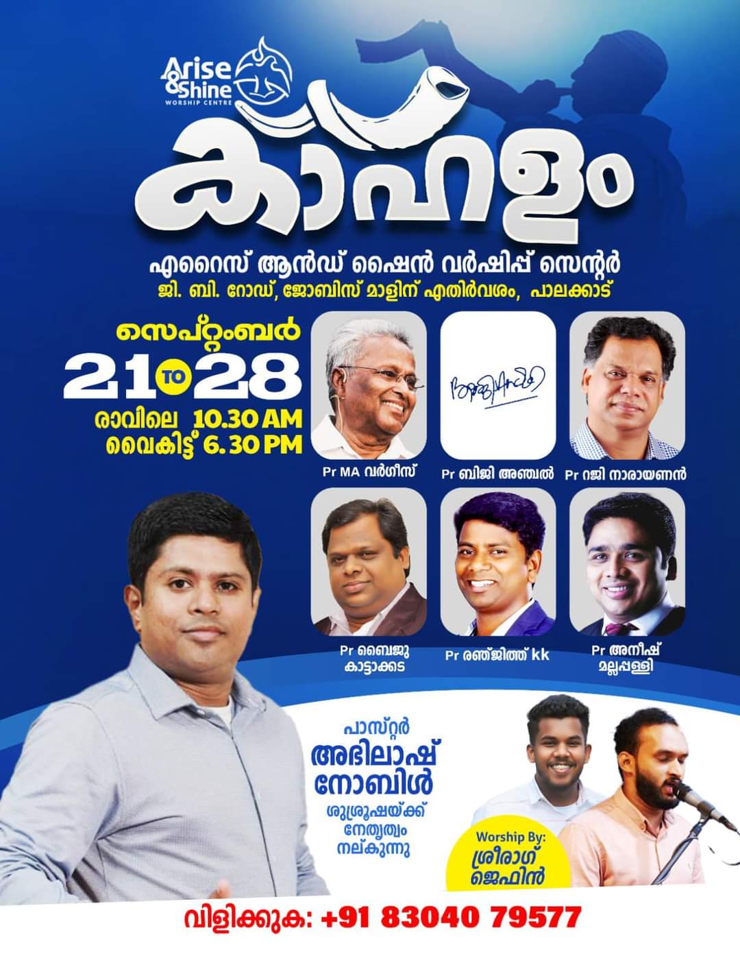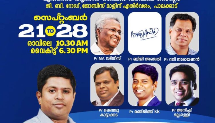 പാലക്കാട് : എറൈസ് ആൻഡ് ഷൈൻ വർഷിപ്പ് സെന്ററിന്റെ ആഭിമുഖ്യത്തിൽ ശനിയാഴ്ച മുതൽ സെപ്റ്റംബർ 28 വരെ പാലക്കാട് ജി. ബി. റോഡ്, ജോബിസ് മാളിന് എതിർവശം എറൈസ് ആൻഡ് ഷൈൻ വർഷിപ്പ് സെന്ററിൽ കാഹളം എന്ന തീമിൽ ഉണർവ് യോഗം നടക്കും.