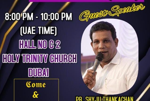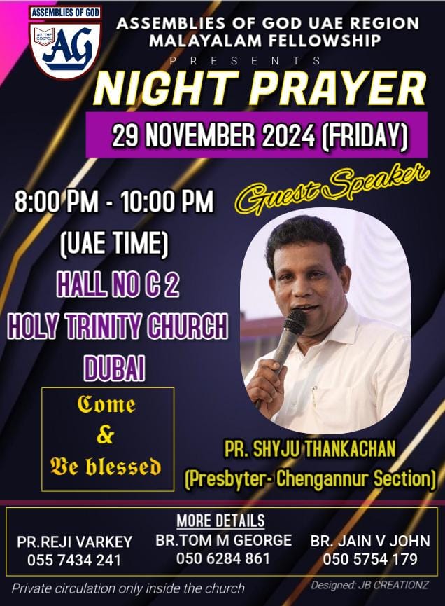 ഷാർജ : അസംബ്ലീസ് ഓഫ് ഗോഡ് യുഎഇ റീജിയൻ മലയാളം ഫെലോഷിപ്പിന്റെ ആഭിമുഖ്യത്തിൽ നവംബർ 29ന് വൈകിട്ട് 8 മണി മുതൽ 10 മണി വരെ ദുബായ് ഹോളി ട്രിനിറ്റി ചർച്ച് ഹാൾ നമ്പർ സി 2വിൽ നൈറ്റ് പ്രയർ നടക്കും.
