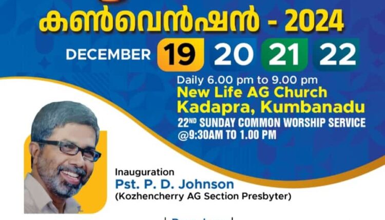 കുമ്പനാട്: അസംബ്ളീസ് ഓഫ് ഗോഡ് കോഴഞ്ചേരി സെക്ഷന്റെയും ന്യൂ ലൈഫ് എ.ജി. കടപ്ര സഭയുടെ ആഭിമുഖ്യത്തിൽ ആത്മമാരി കൺവെൻഷൻ ഡിസം. 19 മുതൽ 22 വരെ ന്യൂ ലൈഫ് എ.ജി. കടപ്ര സഭയിൽ നടക്കും.