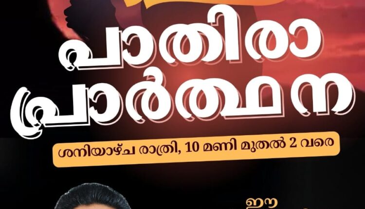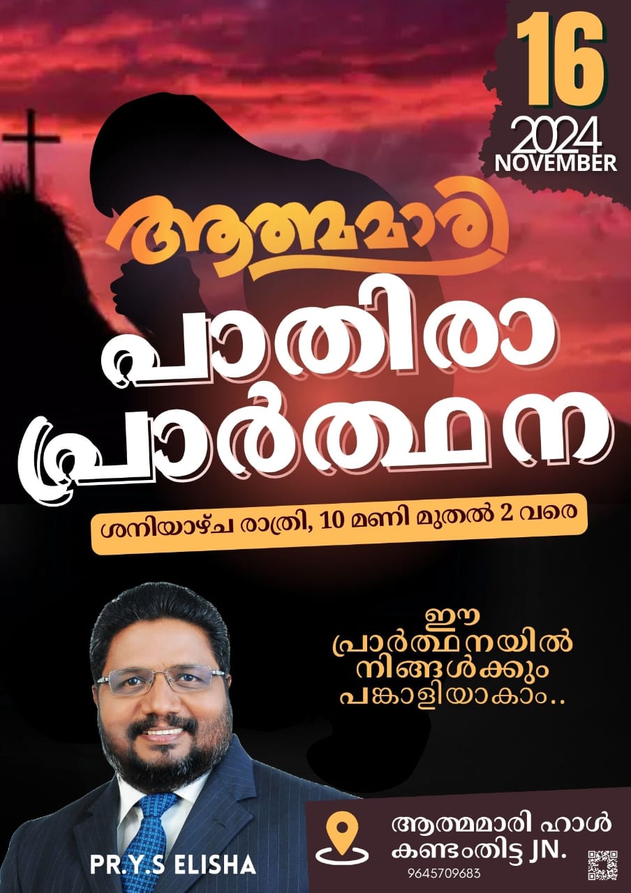 കണ്ടംതിട്ടയിൽ ആത്മമാരി പാതിരാ പ്രാർത്ഥന ChristianNews On Nov 14, 2024 52 കണ്ടംതിട്ട : നവംബർ 16 ന് കണ്ടംതിട്ട ജംഗ്ഷൻ ആത്മമാരി ഹാളിൽ രാത്രി 10 മണി മുതൽ 2 വരെ പാതിരാ പ്രാർത്ഥന നടക്കും. പാ. വൈ. എസ് എലീശാ പ്രസംഗിക്കും. 52 Share