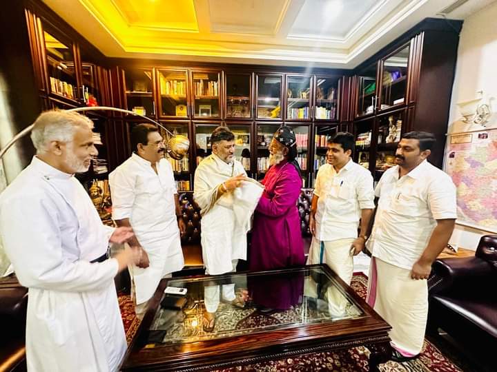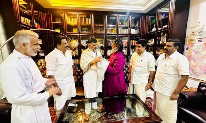 ബാംഗ്ലൂർ: കർണാടക ഉപമുഖ്യമന്ത്രിയും കോൺഗ്രസ് നേതാവുമായ ഡി കെ ശിവകുമാറിനെ ബാംഗ്ലൂരിലെ ഔദ്യോഗിക വസതിയിൽ മലങ്കര മാര്ത്തോമ്മാ സഭാ ഡോ ജോസഫ് മാർ ബർണബാസ് സഫ്രഗൻ മെത്രാപ്പൊലീത്തായുടെ നേതൃത്വത്തിൽ സഭാ ഭാരവാഹികൾ സന്ദര്ശിച്ച് ജന്മദിന ആശംസകൾ അറിയിച്ചു.
