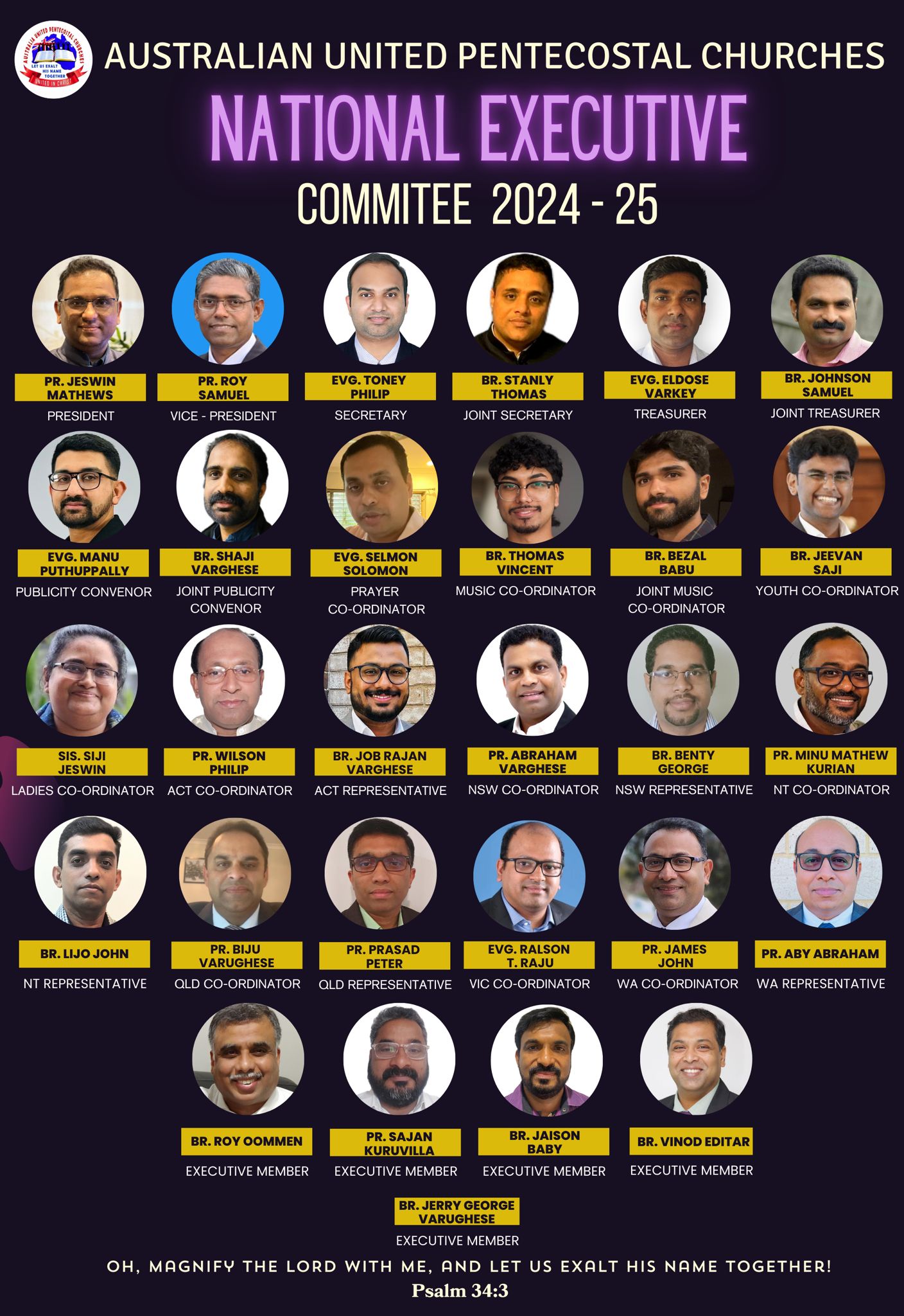 ഓസ്‌ട്രേലിയ : ഓസ്‌ട്രേലിയയിലെ ഏറ്റവും വലിയ പെന്തകോസ്റ്റൽ പ്രവർത്തനമായ ഓസ്‌ട്രേലിയൻ യുണൈറ്റഡ് പെന്തകോസ്റ്റൽ ചർച്ചസ്, എ.യു.പി.സിയുടെ 2024-2025 വർഷത്തേക്കുള്ള നാഷണൽ എക്സിക്യൂട്ടീവ് കമ്മിറ്റിയെ തിരഞ്ഞെടുത്തു.