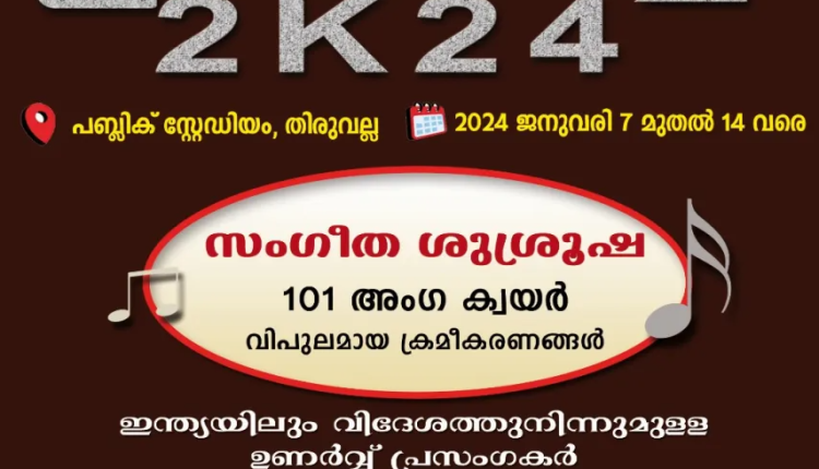 തിരുവല്ല : പെന്തെക്കോസ്തു ഐക്യ കൺവെൻഷൻ 2024 ജനുവരി ഏഴു മുതൽ 14 വരെ തിരുവല്ല , പബ്ളിക്ക് സ്റ്റേഡിയത്തിൽ നടത്തപ്പെടും.