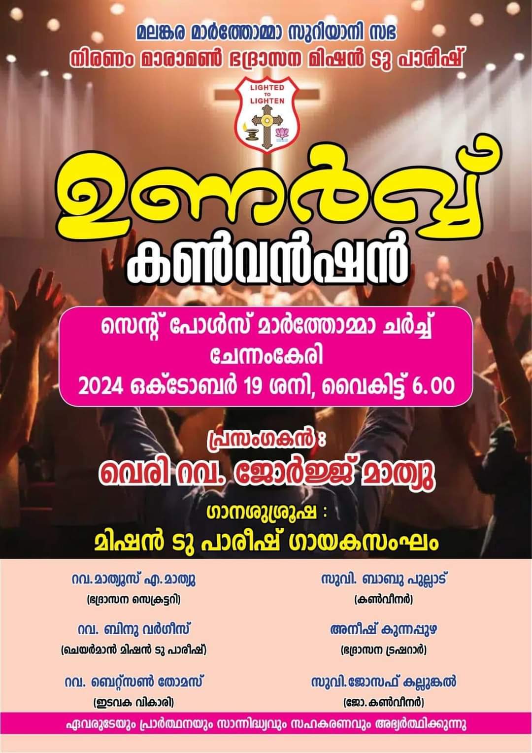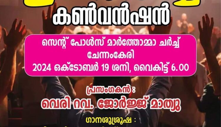 ചേന്നംകേരി : മലങ്കര മാർത്തോമ്മാ സുറിയാനി സഭ നിരണം മാരാമൺ ഭദ്രാസന മിഷൻ ടൂ പാരിഷിന്റെ ആഭിമുഖ്യത്തിൽ ഒക്ടോബർ 19 ശനിയാഴ്ച ചേന്നംകേരി സെന്റ്റ് പോൾസ് മാർത്തോമ്മാ ചർച്ചിൽ ഉണർവ് കൺവൻഷൻ നടക്കും. റവ. ജോർജ്ജ് മാത്യു പ്രസംഗിക്കും. മിഷൻ ടു പാരീഷ് ഗായകസംഘം ഗാന ശുശ്രുഷ നയിക്കും.