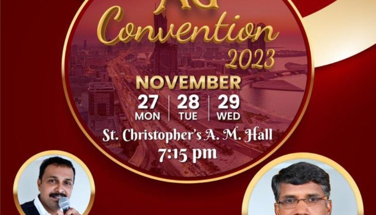 മനാമ: ബഹ്റൈനിലെ ഏ.ജി ചർച്ചിൻ്റെ ആഭിമുഖ്യത്തിൽ നവം. 27 തിങ്കൾ മുതൽ 29 ബുധൻ വരെ മനാമ സെന്റ് ക്രിസ്റ്റഫർ ചർച്ച് എ.എം ഹാളിൽ എല്ലാ ദിവസവും വൈകിട്ട് 7.15 മുതൽ പൊതുയോഗങ്ങൾ നടക്കും. പാസ്റ്റർ അനിൽ കോടിത്തോട്ടം മുഖ്യ പ്രഭാഷണം നടത്തും. ബ്രദർ സാംസൺ ചെങ്ങന്നൂർ ഉൾപ്പെട്ട ഏ.ജി ചർച്ച് ക്വയർ ആരാധനയ്ക്ക് നേതൃത്വം നൽകും.