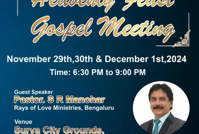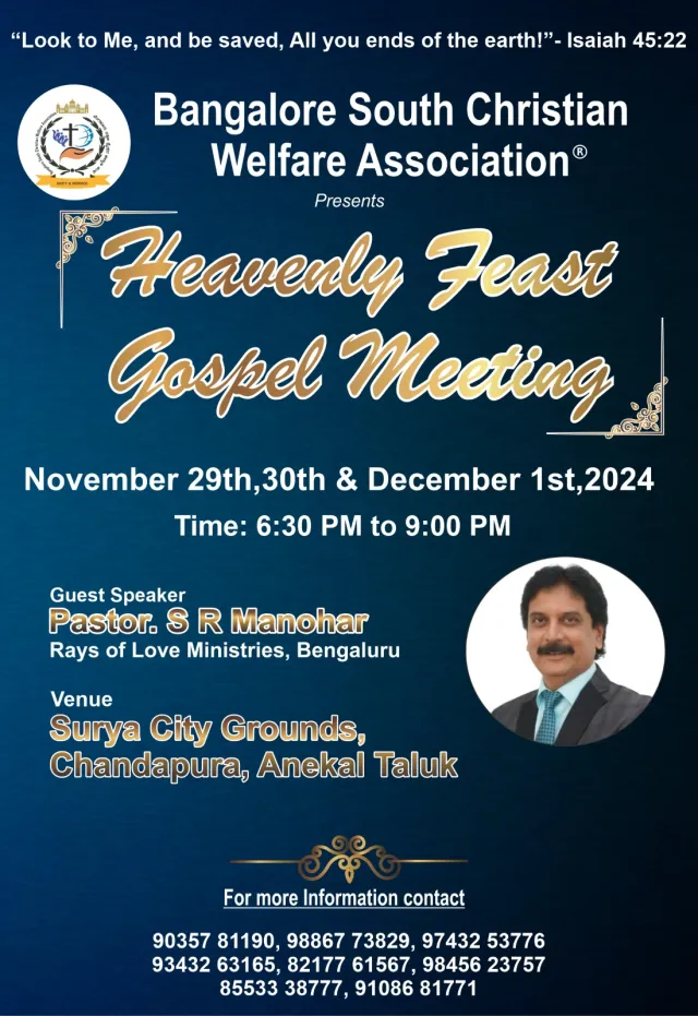 ബാംഗ്ലൂർ സൗത്ത് ക്രിസ്ത്യൻ വെൽഫയർ അസോസിയേഷൻ ഗോസ്പെൽ മീറ്റിംഗ് ChristianNews On Nov 13, 2024 35 ബാംഗ്ലൂർ : ബാംഗ്ലൂർ സൗത്ത് ക്രിസ്ത്യൻ വെൽഫയർ അസോസിയേഷന്റെ ആഭിമുഖ്യത്തിൽ നവംബർ 29 മുതൽ ഡിസംബർ1 വരെ അനേകൽ താലൂക്കിലെ ചന്ദപുര സൂര്യ സിറ്റി ഗ്രൗണ്ടിൽ ഹെവൻലി ഫീസ്റ്റ് ഗോസ്പെൽ മീറ്റിംഗ് നടക്കും. പാ. ആർ മനോഹർ പ്രസംഗിക്കും. 35 Share