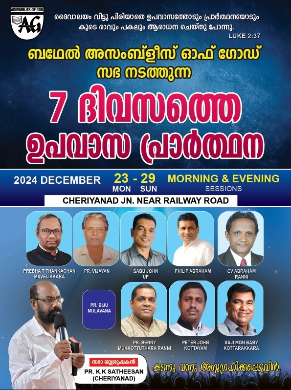 ചെറിയനാട് : ബെഥേൽ അസംബ്ലീസ് ഓഫ് ഗോഡ് സഭയുടെ ആഭിമുഖ്യത്തിൽ ഡിസംബർ 23 മുതൽ 29 വരെ ചെറിയനാട് ജംഗ്ഷൻ റെയിൽവേ റോഡിന് സമീപം 7 ദിവസത്തെ ഉപവാസ പ്രാർത്ഥന നടക്കും.