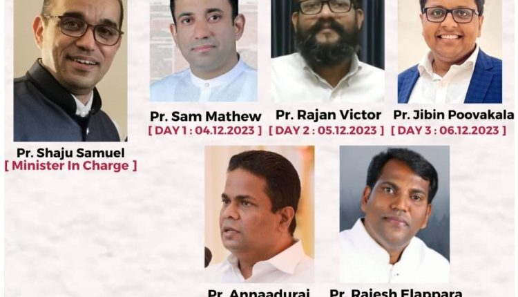 പാസ്റ്റർമാരായ സാം മാത്യു , രാജൻ വിക്ടർ , ജിബിൻ പൂവക്കാല , അണ്ണാദുരെ , രാജേഷ് ഏലപ്പാറ എന്നിവർ പ്രസംഗിക്കും. സീനിയർ ശുശ്രൂഷകൻ പാസ്റ്റർ ഷാജു ശാമുവേൽ നേതൃത്വം നല്കും .