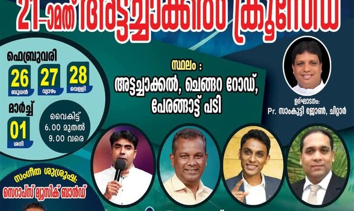 അട്ടച്ചാക്കൽ : അട്ടച്ചാക്കൽ ബെഥേൽ ഐപിസി പ്രെയർ സെൻ്ററിന്റെ ആഭിമുഖ്യത്തിൽ ഫെബ്രുവരി 26 മുതൽ മാർച്ച് 1 വരെ പേരങ്ങാട്ട് പടി ചെങ്ങറ റോഡ് അട്ടച്ചാക്കലിൽ 21 -മത് അട്ടച്ചാക്കൽ ക്രൂസേഡ് നടക്കും.