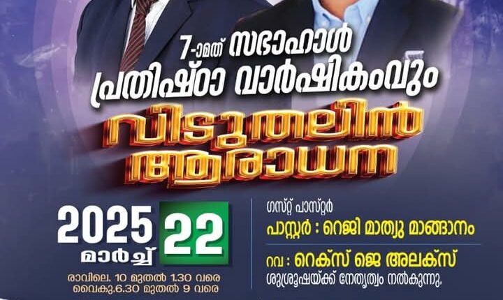 തിരുവനന്തപുരം : ബെഥേസ്ഥ ക്രിസ്ത്യൻ അസംബ്ലി അപ്പോസ്തോലിക് ആൻഡ് പ്രൊഫറ്റിക്കൽ ഇന്റർനാഷണൽ ചർച്ചിന്റെ ആഭിമുഖ്യത്തിൽ മാർച്ച് 22 ന് കാട്ടാക്കട ചൂണ്ടുപലക സുവിശേഷ പ്രസംഗ മന്ദിരത്തിൽ 7-ാമത് സഭാഹാൾ പ്രതിഷ്ഠാ വാർഷികവും വിടുതലിൻ ആരാധനയും നടക്കും. പാ. റെജി മാത്യു മാങ്ങാനം പ്രസംഗിക്കും. , റവ. റെക്സ് ജെ അലക്സ് നേതൃത്വം നൽകും.