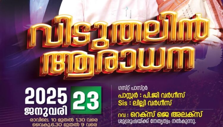 തിരുവനന്തപുരം : ബെഥേസ്ഥ ക്രിസ്ത്യൻ അസംബ്ലി അപ്പോസ്തോലിക് ആൻഡ് പ്രൊഫറ്റിക്കൽ ഇന്റർനാഷണൽ ചർച്ചിന്റെ ആഭിമുഖ്യത്തിൽ ജനുവരി 23 ന് കാട്ടാക്കട ചൂണ്ടുപലക സുവിശേഷ പ്രസംഗ മന്ദിരത്തിൽ ഉണർവ് യോഗം നടക്കും. പാ. പി ജി വർഗീസ്, സിസ്റ്റർ ലില്ലി വർഗീസ് എന്നിവർ പ്രസംഗിക്കും. റവ. റെക്സ് ജെ അലക്സ് നേതൃത്വം നൽകും.