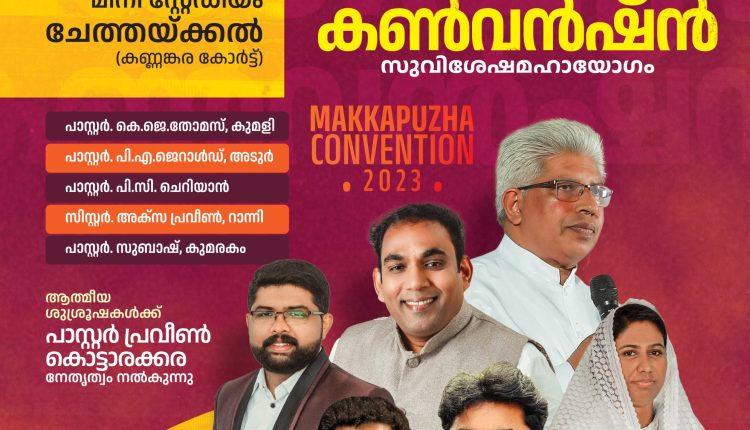 ബെഥേസ്ഥ ചർച്ച് ഓഫ് ഗോഡ് (ഫുൾ ഗോസ്പൽ )മക്കപ്പുഴ ഒരുക്കുന്ന മക്കപുഴ കൺവൻഷൻ 2023 ഡിസംബർ 4 മുതൽ 8 വരെ റാന്നി ചേത്തക്കലുള്ള പഴവങ്ങാടി ഗ്രാമപഞ്ചായത്ത് മിനി സ്റ്റേഡിയത്തിൽ നടത്തപെടും. കൺവെൻഷനിൽ പാസ്റ്റർ കെ ജെ തോമസ്കുട്ടി, പാസ്റ്റർ പി എ ജെറാൾഡ്, പാസ്റ്റർ പി സി ചെറിയാൻ , പാസ്റ്റർ കെ എ എബ്രഹാം, സിസ്റ്റർ അക്സ പ്രവീൺ റാന്നി , പാസ്റ്റർ സുഭാഷ് കുമരകം എന്നിവർ ശുശ്രൂഷിക്കും. മിസിയോ ഡെയ് മ്യൂസിക് ബാൻഡ് ഗാനങ്ങൾ ആലപിക്കും. പാസ്റ്റർ പ്രവീൺ കൊട്ടാരക്കര കൺവൻഷന് നേതൃത്വം നൽകുന്നു. കൂടുത വിവരങ്ങൾക്ക് 8921550310