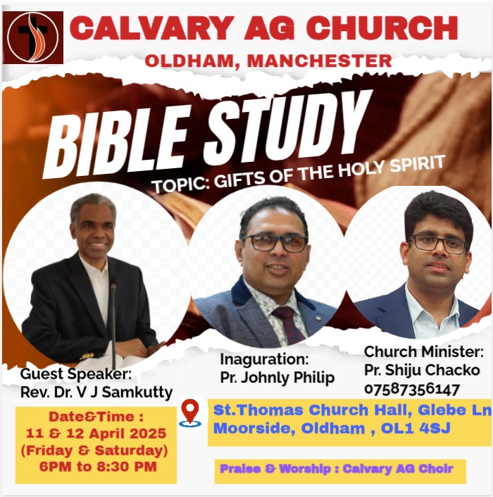 മാഞ്ചസ്റ്റർ : മാഞ്ചസ്റ്റർ കാൽവറി അസംബ്ളീസ് ഓഫ് ഗോഡ് സഭയുടെ ആഭിമുഖ്യത്തിൽ ഏപ്രിൽ മാസം 11,12(വെള്ളി, ശനി) തീയതികളിൽ ഓൾഡ്ഹാമിൽ സെന്റ് തോമസ് ചർച്ചിന്റെ കമ്മ്യൂണിറ്റി ഹാളിൽ വൈകിട്ട് 6 മുതൽ 8:30 വരെ ബൈബിൾ ക്ലാസ് നടക്കും.