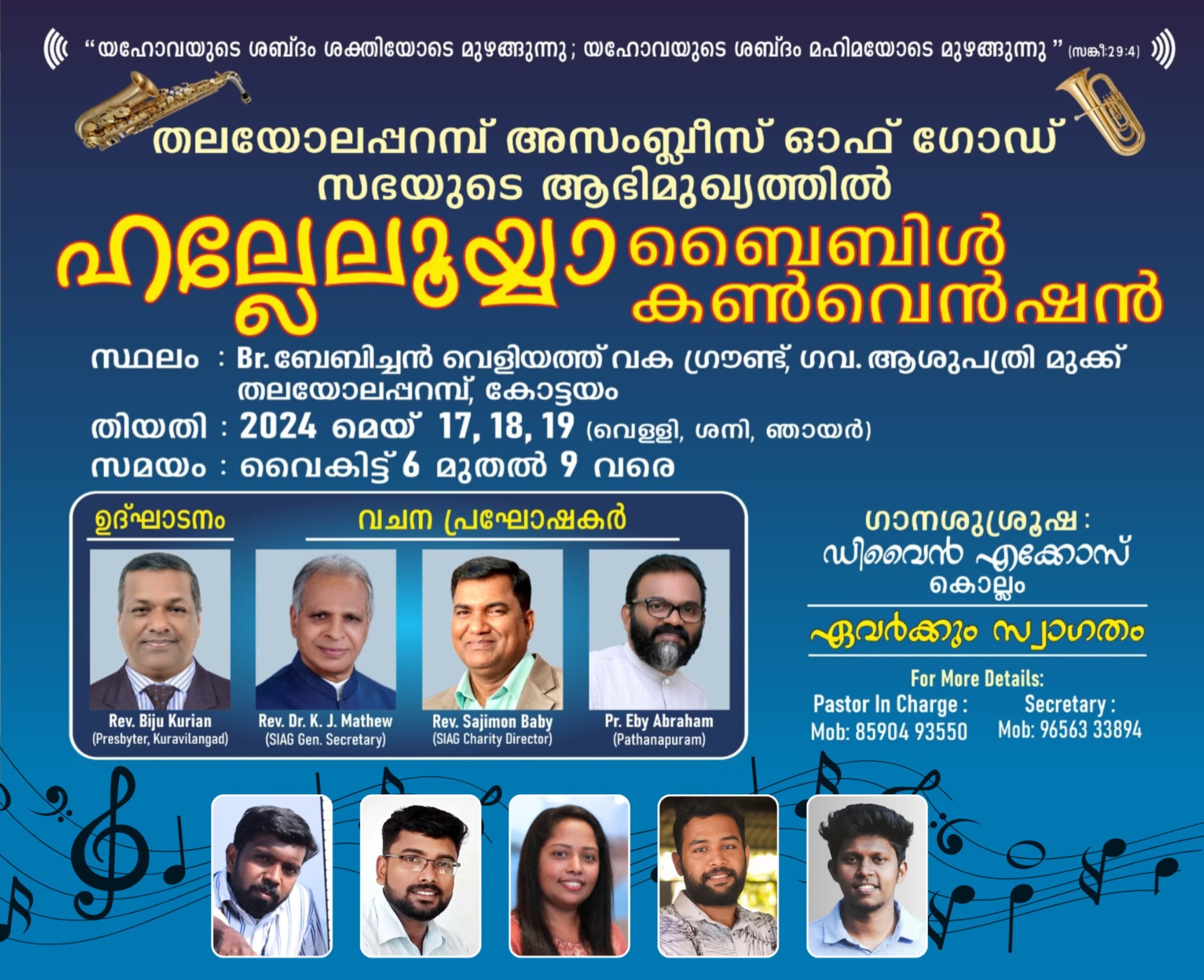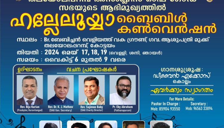 കോട്ടയം: തലയോലപ്പറമ്പ് അസംബ്ലിസ് ഓഫ് ഗോഡ് സഭയുടെ ആഭിമുഖ്യത്തിൽ ബ്രദർ ബേബിച്ചൻ വെള്ളിയത്ത് വക ഗ്രൗണ്ടിൽ നാളെ മുതൽ മൂന്ന് ദിവസത്തെ ബൈബിൾ കൺവെൻഷൻ നടക്കുന്നു.വൈകിട്ട് 6 മണി മുതൽ 9 മണി വരെയാണ് സമയം ക്രമീകരിച്ചിരിക്കുന്നത്. റവ. ബൈജു കുര്യൻ ഉദ്ഘാടനം ചെയ്യും. റവ. കെജെ മാത്യു, റവ. സജിമോൻ ബേബി,പാ. എബി എബ്രഹാം എന്നിവർ ദൈവവചനം പ്രസംഗിക്കും. ഡിവൈൻ എക്കോസ് കൊല്ലം ഗാനശുശ്രുഷ നയിക്കും.