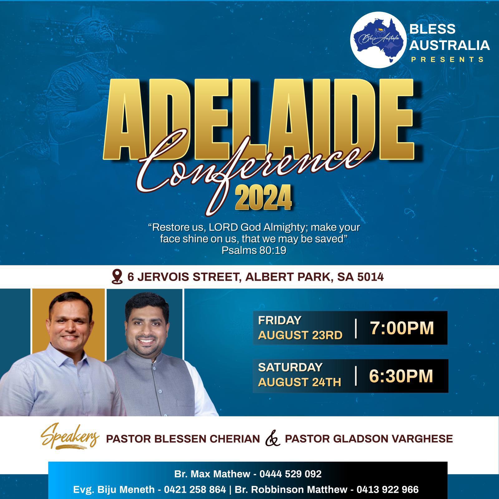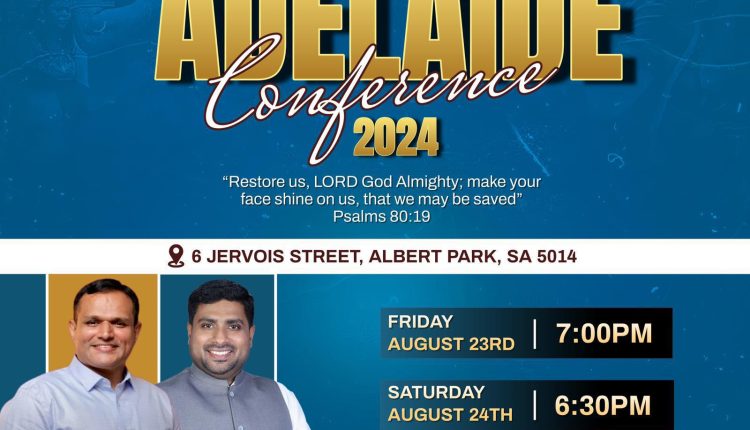 അഡലൈഡ് : അഡലൈഡിലെ വിവിധ സഭകളുടെ സംയുക്ത ആഭിമുഖ്യത്തിൽ വെള്ളി, ശനി ദിവസങ്ങളിൽ ദേശത്തിന്റെ ഉണർവ്വിനായി കോൺഫെറെൻസ് നടക്കും. പാ. ബ്ലെസ്സൻ ചെറിയാൻ, പാ. ഗ്ലാഡ്സൺ വർഗീസ് എന്നിവർ പ്രസംഗിക്കും. മീറ്റിംഗിൽ യുവജനങ്ങൾക്കുവേണ്ടി പ്രത്യേക സെക്ഷൻ ക്രമീകരിച്ചിട്ടുണ്ട്.