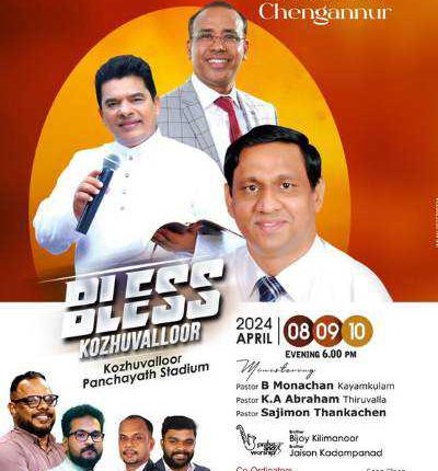 കൊഴുവല്ലൂർ : ഗ്ലോറിയസ് റിവൈവൽ ഇന്റർനാഷണൽ മിനിസ്ട്രിയുടെ ആഭിമുഖ്യത്തിൽ “ബ്ലെസ്സ് കൊഴുവല്ലൂർ കൺവെൻഷൻ” ഏപ്രിൽ 8 മുതൽ 10 വരെ വൈകിട്ട് 6 മുതൽ 9 മണി വരെ കൊഴുവല്ലൂർ പഞ്ചായത്ത് ഗ്രൗണ്ടിൽ നടക്കുന്നു. പാസ്റ്റർമാരായ ബി. മോനച്ചൻ , കെ .എ. എബ്രഹാം , സജിമോൻ തങ്കച്ചൻ എന്നിവർ ദൈവവചനം പ്രസംഗിക്കും . ബിജോയ് കിളിമാനൂർ , ജെയ്സൺ കടമ്പനാട് എന്നിവർ സംഗീത ശുശ്രുഷ നിർവഹിക്കും.