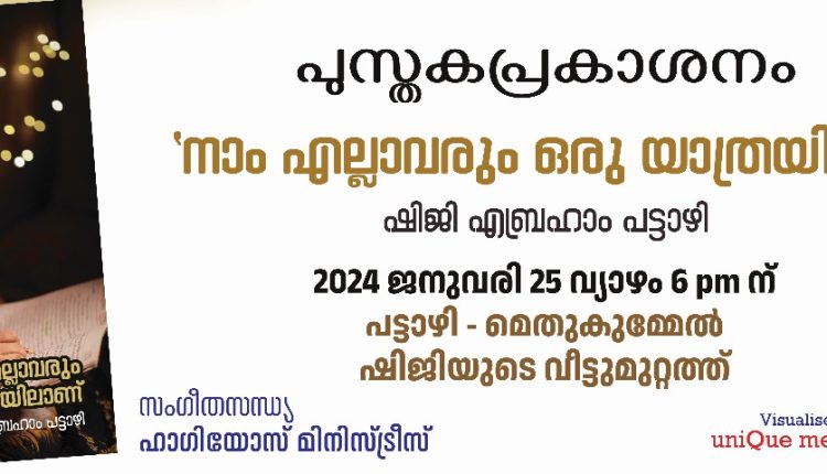 ബഥേലിലെ രാജകുമാരി എന്നറിയപ്പെടുന്ന പട്ടാഴി മെതുകുമ്മേൽ ഷിജി എബ്രഹാം പട്ടാഴി എഴുതിയ ‘നാം എല്ലാവരും ഒരു യാത്രയിലാണ് ‘ എന്ന പുസ്തകം ഇന്ന് വൈകിട്ട് 6ന് പ്രകാശനം ചെയ്യും. ഷിജിയുടെ വീട്ടുമുറ്റത്ത് അയല്ക്കാരും സഭാംഗങ്ങളും സ്നേഹിതരും സഹപാഠികളും സാമൂഹ്യ സാംസ്കാരിക പ്രവർത്തകരും ഒക്കെ ഒത്തു കൂടുന്ന വേദിയിൽ ഷിജിയോടൊപ്പം നില്കുന്ന സമൂഹങ്ങളുടെ പ്രതിനിധികളായി ഒരു കൂട്ടം വ്യക്തികൾ ഒന്നിച്ചാണ് പുസ്തകം പ്രകാശനം ചെയ്യുന്നത്. ഹാഗിയോസ് മിനിസ്ട്രീസ് സംഗീതസന്ധ്യ നയിക്കും.