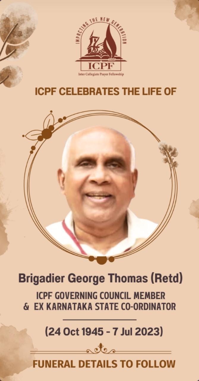 ബാംഗ്ലൂർ: ഐസി പി എഫിന്റെ ഗവേണിംഗ് കൗൺസിൽ അംഗവും കർണ്ണാടകയിലെ മുൻ സ്റ്റേറ്റ് കോർഡിനേറ്ററുമായ കമാൻ ഹള്ളി ഐ പി സി ശാലേം വർഷിപ്പ് സെന്റർ അംഗം പാസ്റ്റർ ജി. തോമസ് (ബ്രിഗേഡിയർ അങ്കിൾ, 77) നിത്യതയിൽ പ്രവേശിച്ചു. മൂവാറ്റുപുഴ വാളകം സ്വദേശിയാണ്.