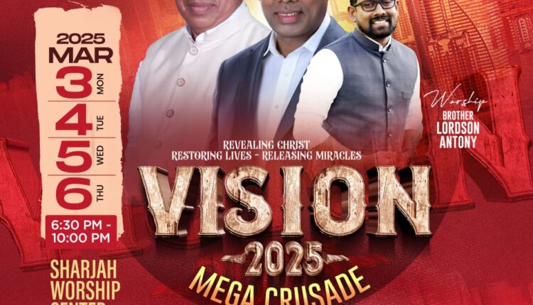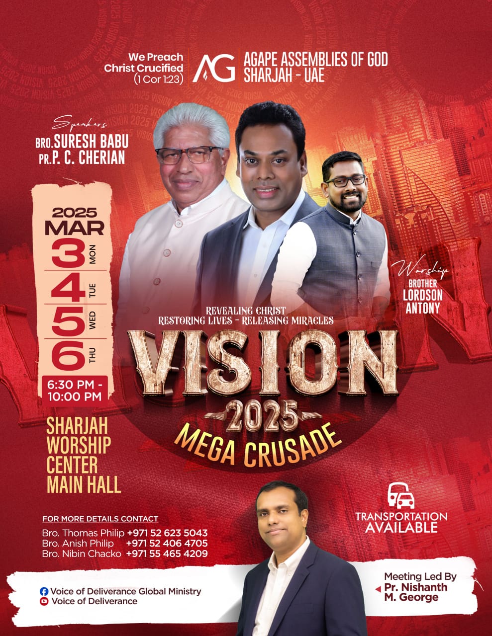 യുഎഇയിലെ സഭകളുടേയും വിശ്വസികളുടേയും ആത്മിക മുന്നേറ്റം ലക്ഷ്യമിട്ട് ഒരുക്കിയിരിക്കുന്ന യോഗങ്ങളുടെ സുഗമമായ നടത്തിപ്പിന് വിപുലമായ ടീം പ്രവർത്തിക്കുന്നതായി പാസ്റ്റർ നിഷാന്ത് എം. ജോർജ് അറിയിച്ചു. 2025 മാർച്ച്‌ 6 വ്യാഴാഴ്ച രാത്രിയോഗത്തോടെ വിഷൻ 2025 മെഗാ ക്രൂസേഡ് സമാപിക്കും.