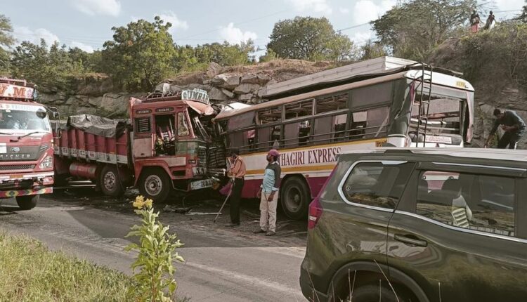 തിരുപ്പതി : ചിറ്റൂർ-ബെംഗളൂരു ദേശീയ പാതയിലെ ഏറ്റവും അപകടരമായ മൊഗിലി ഘാട്ട് സെക്ഷനിൽ ബസ് രണ്ട് ലോറികളിൽ ഇടിച്ച് അപകടം. അപകടത്തില്‍ എട്ടുപേർ മരിച്ചു. എ.പി.എസ്.ആർ.ടി.സി ബസില്‍ യാത്രചെയ്തവരാണ് മരിച്ചവരും പരിക്കേറ്റവരും. തിരുപ്പതിയില്‍നിന്ന് ബെംഗളൂരുവിലേക്ക് പോകുകയായിരുന്ന ബസ് ലോറികളിലിടിച്ചതാണ് അപകടം. പരിക്കേറ്റവരില്‍ നിരവധി ആളുകളുടെ നില അതീവ ഗുരുതരമാണ്. ഇവരെ വിവിധ ആശുപത്രികളിലായി പ്രവേശിപ്പിച്ചിട്ടുണ്ട്.