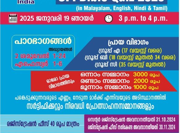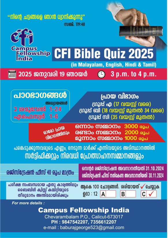 ചേവരമ്പലം : ക്യാമ്പസ് ഫെല്ലോഷിപ്പ് ഇന്ത്യയുടെ ആഭിമുഖ്യത്തിൽ 2025 ജനുവരി 19 ന് സിഎഫ്ഐ ബൈബിൾ ക്വിസ് 2025 നടക്കും. 2 ശമൂവേൽ 1-24, എഫെസ്യർ 1-6 എന്നിവയാണ് പഠന ഭാഗങ്ങൾ.