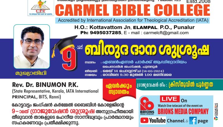 പുനലൂര് : ഇളബല് കേന്ദ്രമാക്കി 15 വര്ഷമായി പ്രവര്ത്തിച്ച് വരുന്ന വേദ പഠന ശാലയായ കര്മ്മേല് ബെെബിള് കോളേജിന്റെ 9 -ാമതു ഗ്രാജുവേഷന് പുനലൂര് എബനേസര് പാര്ക്ക് ആഡിറ്റോറിയത്തില്വച്ച് മെയ് 14 ചൊവ്വാഴ്ച രാവിലെ 9:30 മുതല് നടക്കും.ഈ ശുശ്രൂഷയുടെ മുഖ്യാതിഥിയായി റവ. ഡോ. ബിനുമോൻ പി.കെ (സ്റ്റേറ്റ് റെപ്രെസെന്ററ്റീവ് ഐഎടിഎ ) പങ്കെടുക്കും. ഗ്രാജുവേഷന് തീം: ക്രിസ്തുവില് പൂര്ണ്ണത. പുതിയ ബാച്ചിലേക്കുള്ള അഡ്മിഷന് ആരംഭിച്ചതായി ഭാരവാഹികൾ അറിയിച്ചു.