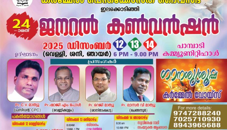 പാമ്പാടി : കർമ്മേൽ പെന്തക്കോസ്ത് ദൈവസഭയുടെ 24 – മത് ജനറൽ കൺവൻഷൻ, ഡിസംബർ 12, 13, 14 ( വെള്ളി, ശനി, ഞായർ ) പാമ്പാടി കമ്മ്യൂണിറ്റി ഹാളിൽ നടക്കും.